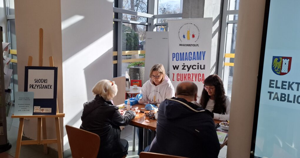 Światowy Dzień Cukrzycy już za nami. Nasz Słodki Przystanek w Urzędzie Miasta Gliwice odwiedziło ponad 300 osób!!! Dziękujemy Miastu Gliwice za pomoc w realizacji akcji profilaktycznej i gliwiczanom za tak liczną obecność. Dziękujemy instytucjom, które pomogły w uświetnieniu tego dnia – Palmiarni i Radiostacji za niebieskie podświetlenie oraz Śląskiej Sieci Metropolitarnej za akcję edukacyjną na telebimach. Wszystkim pacjentom dzieciom, młodzieży i dorosłym, którzy na co dzień zmagają z cukrzycą życzymy siły i wytrwałości w walce z tą trudną i wymagającą chorobą .